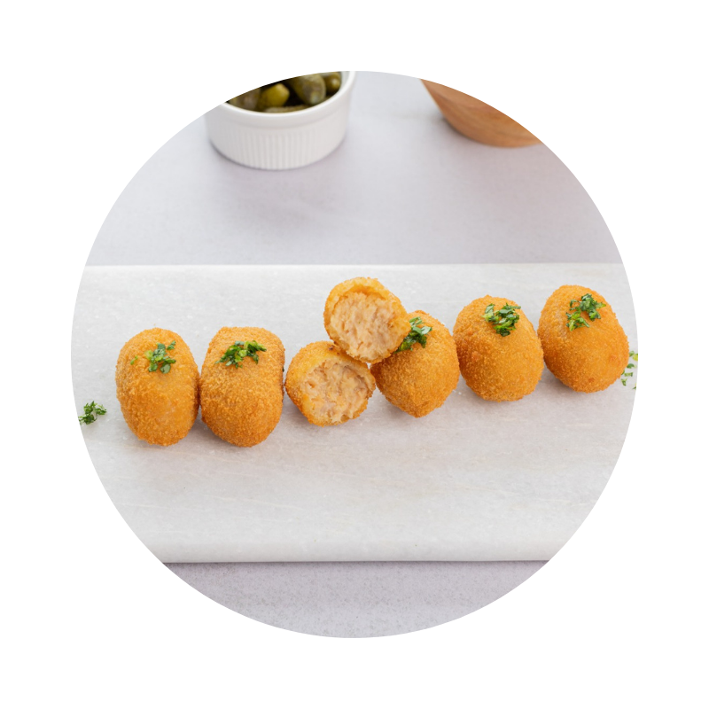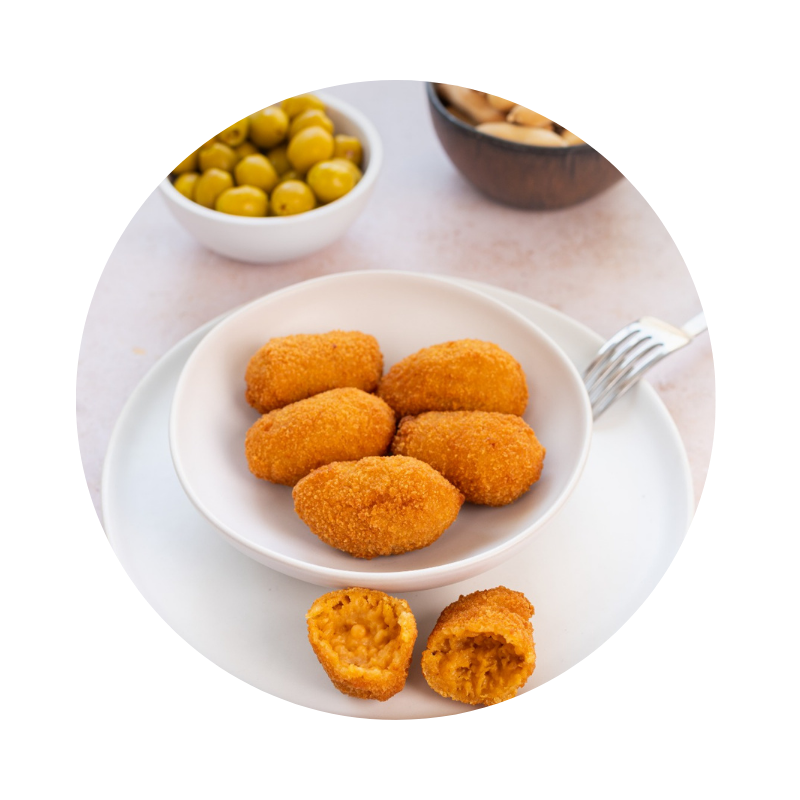 La bechamel, fina y extraordinariamente cremosa, se funde con la jugosidad de sus ingredientes, logrando una textura sedosa en el interior y un rebozado delicado que, tras la fritura, ofrece un crujiente elegante y dorado.