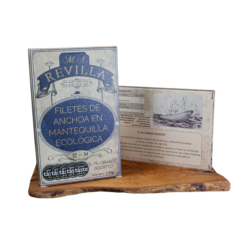 Con estas sabrosas anchoas en mantequilla ecológica, queremos hacer un homenaje a los primeros salazoneros italianos que, ante la falta de capturas en la costa italiana, vinieron buscando bocartes a nuestra costa, convirtiendo a Santoña en “La Cuna de la Anchoa”.